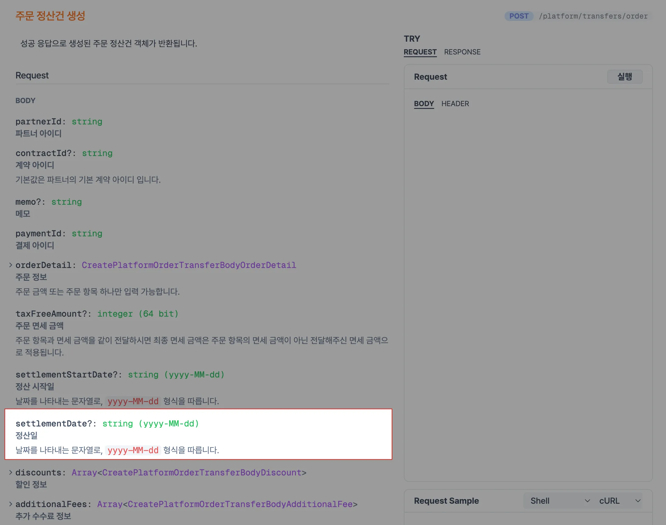 μ μ° μ£ΌκΈ°λ‘ ννν μ μλ λΆκ·μΉμ μΈ μ μ° μΌμ μ νμ©νμκ³ κ³μ κ²½μ°, μ£Όλ¬Έ/μ£Όλ¬Έμ·¨μ μ μ° κ±΄ μμ± μ settlementDate λ₯Ό μ§μ νμ